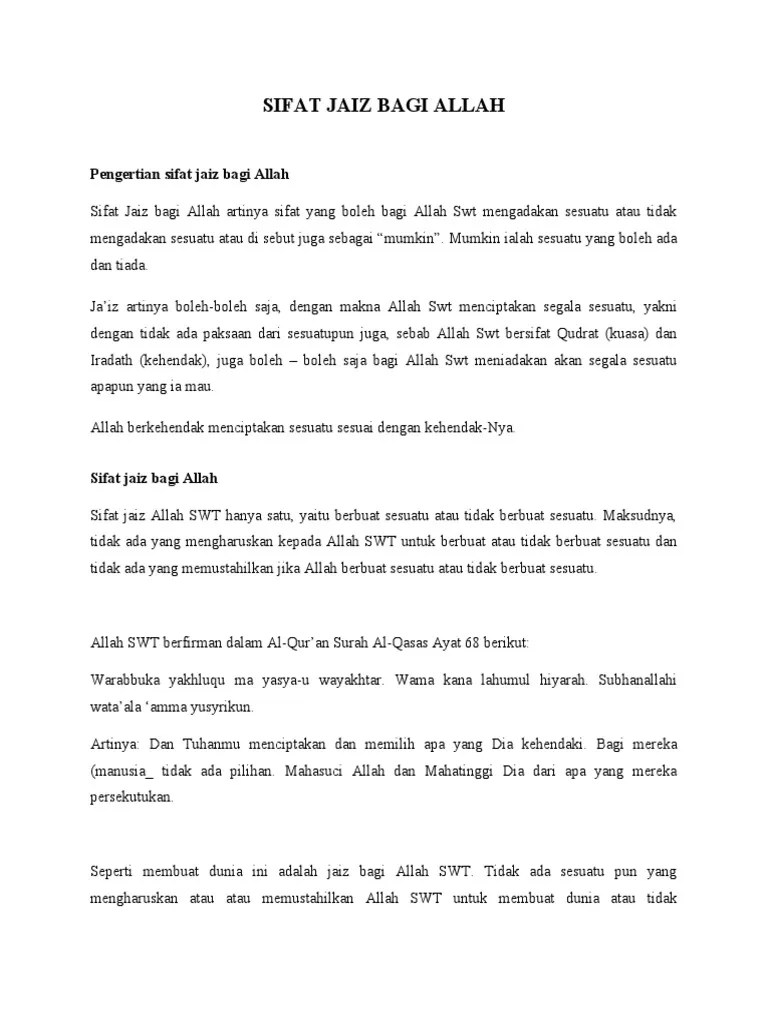 sifat harus atau sifat jaiz juga dimiliki oleh allah. Daftar isi sembunyikan 1 bacaan niat sholat subuh arab, latin beserta artinya. sifat wujud artinya allah adalah zat yang pasti ada. Maksudnya, allah adalah zat yang pasti ada, dia berdiri sendiri, tidak diciptakan oleh siapapun dan tidak ada tuhan selain allah ta'ala. sifat jaiz para nabi dan rasul. Siddiq (artinya benar) nabi dan rasul selalu di jaga oleh allah swt, oleh sebab itu baik secara ucapan atau pun perbuatan senantiasa bersifat benar. sifat ini bersih serta tidak berada di depan dan belakang sesuatu, juga bersih dari i'rab dan bina' Tabel sifat sifat allah swt sifat wajib sifat mustahil sifat jaiz 1 wujud ada 2 from aa 1 Siddiq secra bahasa artinya adalah jujur. Menunjukkan dalil tentang sifat wajib dan mustahil yang nafsiyah, salbiyah. sifat yang jaiz bagi allah hanya satu yaitu: sifat jaiz rasul adalah semua sifat kemanusiaan yang ada pada diri rasul sebagai seorang manusia dan tidak mengurangi kedudukannya sebagai utusan allah swt 9 daftar pustaka suryana, toto, 2002pendidikan agama islam, jakarta, pt.raja grafindo persada. Kebalikannya adalah sifat mustahil, yaitu sifat yang tidak mungkin berada pada dzat allah swt.
