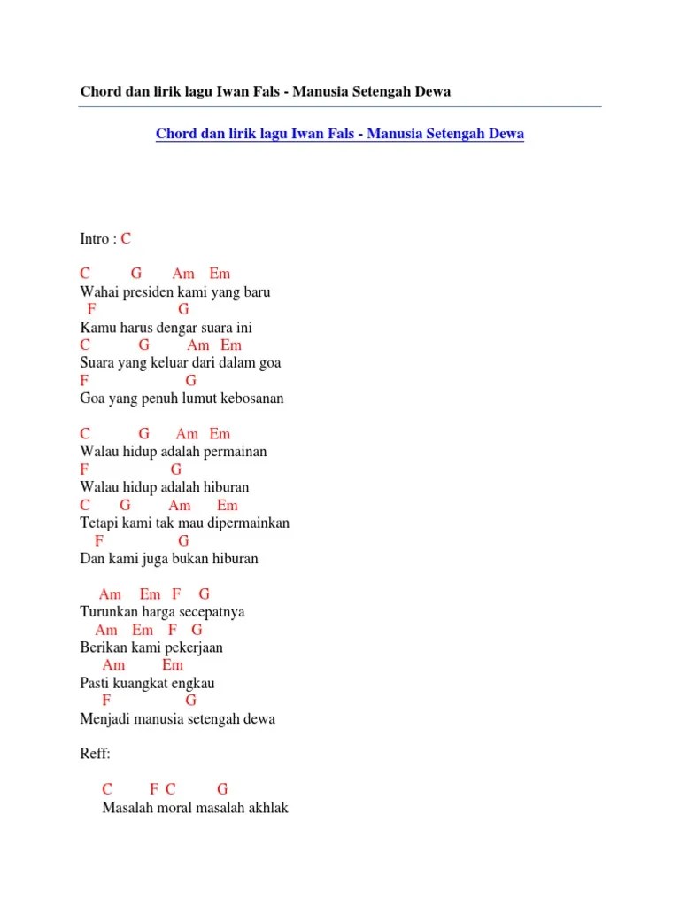 C c c c c g am em wahai presiden kami yang baru f g kamu harus dengar suara ini c g am em suara yang keluar dari dalam goa f g goa yang penuh. Lagu berjudul manusia setengah dewa dirilis pada tahun 2004. Kunci gitar lagu manusia setengah dewa dapat . A a e f#m c#m wahai presiden kami yang baru d e kamu dengar suara ini . Liriknya yang satir membuat lagu dari iwan fals ini digandrungi para penggemarnya, ini dia chord gitar dan lirik lagu manusia setengah dewa.